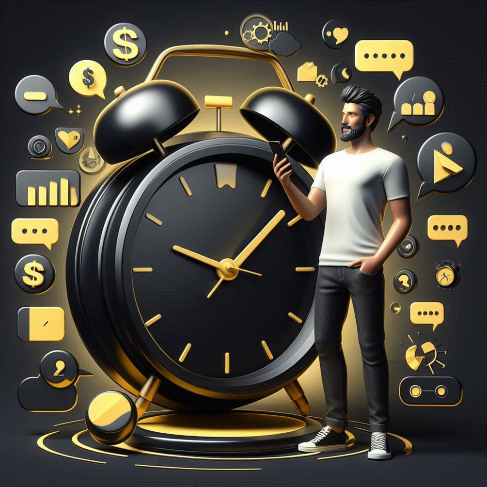 3D illustration suitable for a website. The illustration should feature a man with a beard, wearing a white t-shirt and jeans, standing on the right side of the image. He should be holding a smartphone and gesturing towards floating icons around him, including dollar signs, chat bubbles, progress checklists, and loading circles, all in a black and yellow color palette. Leave ample space on the left side for website content, and ensure the design is clean and modern, with a dark background to enhance the contrast of the bright elements